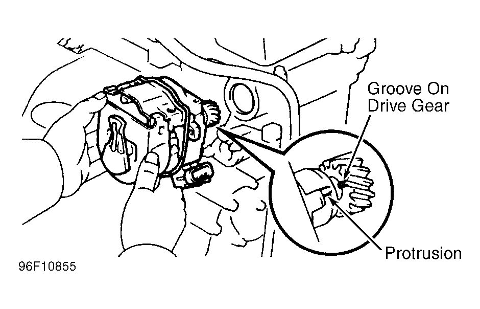 2. Install NEW "O" ring on distributor housing. Coat "O" ring with engine oil. Align groove on drive gear with protrusion on distributor housing. See Fig 2.