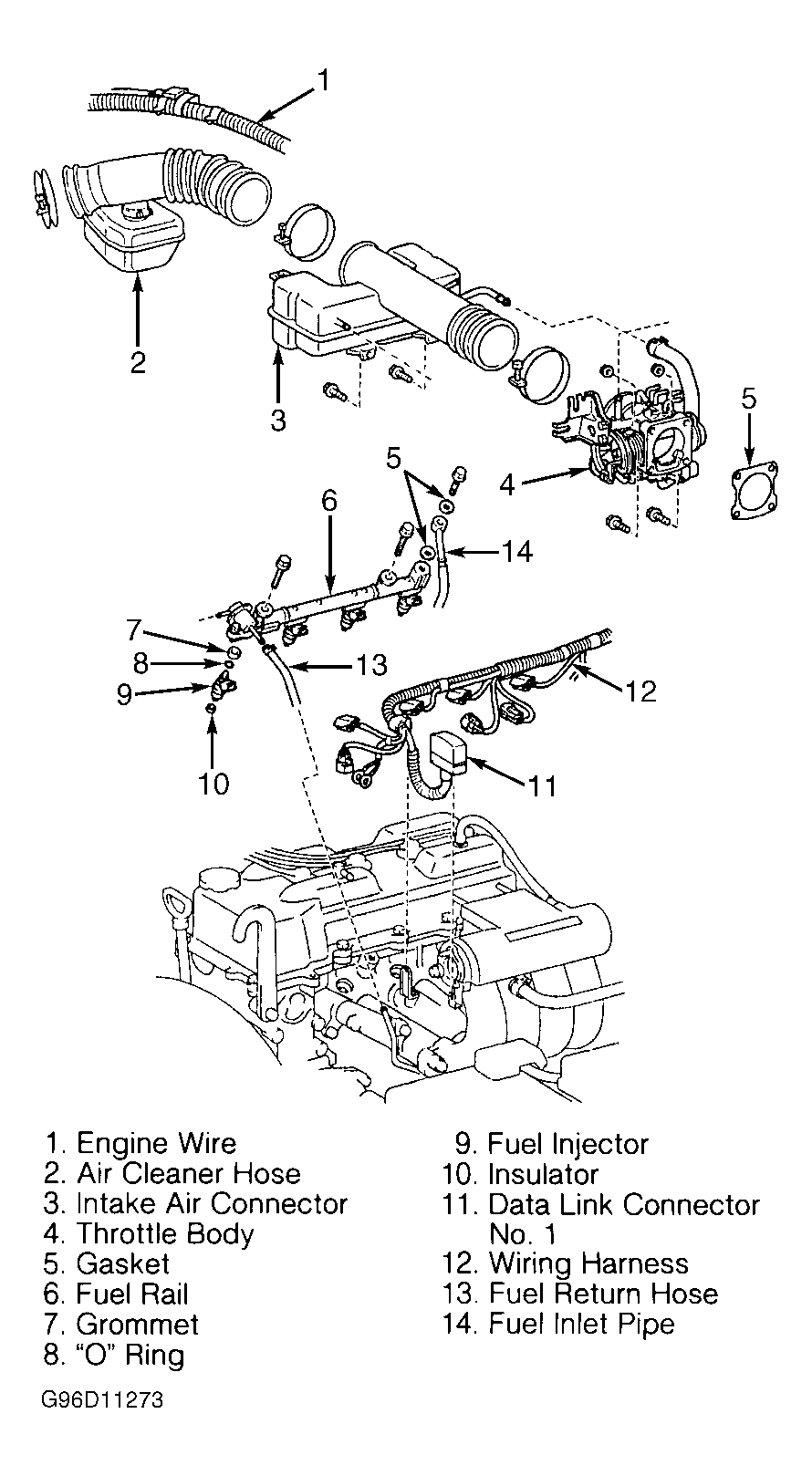 - Remove air intake chamber, intake air connector and gaskets. Remove protector from engine wiring harness and lift engine wiring harness upward for access to fuel pressure regulator.