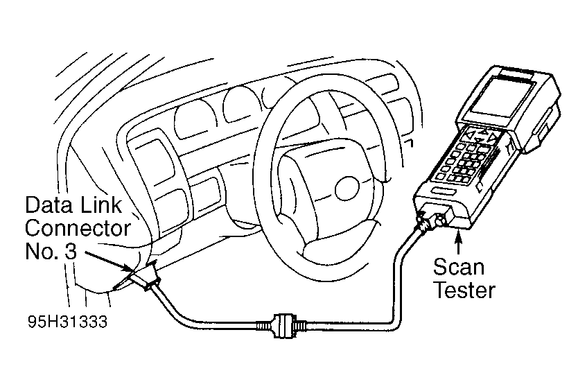 1. Remove cover (if equipped) and install scan tester on data link connector No. 3. See Figure. Turn ignition on. DO NOT start engine.