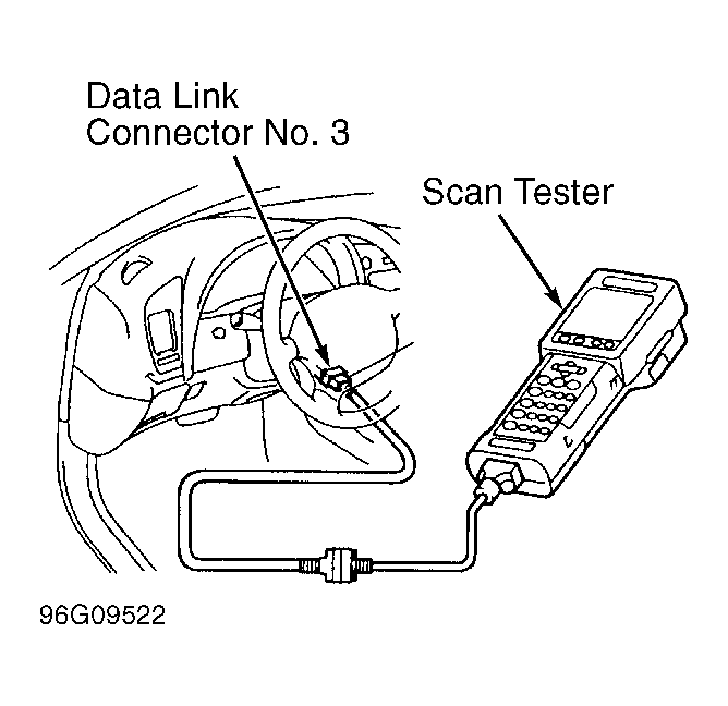 1. Remove cover (if equipped) and install scan tester on data link connector No. 3. See Figure. Turn ignition on. DO NOT start engine.