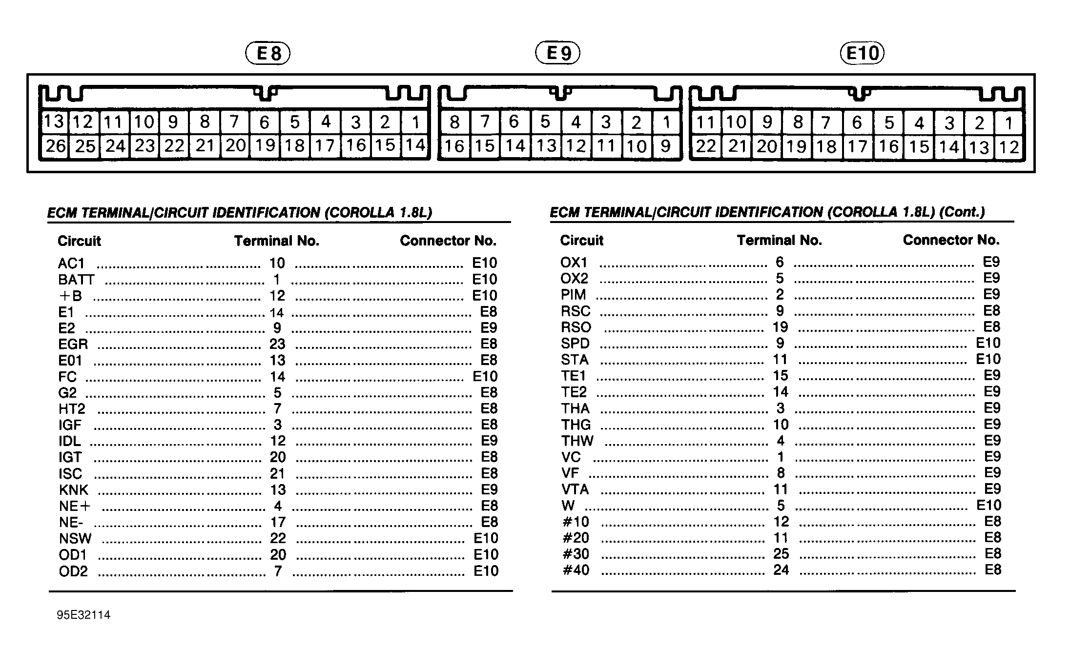 - Access ECM behind bottom center of instrument panel, in front of console. Turn ignition on. Backprobing ECM connector, measure voltage between terminals No. 1 (Red wire) and No. 9 (Brown wire) at ECM E9 connector. See Figure. If voltage is 4.5-5.5 volts, check wiring harness for an open in Red wire. If voltage is not 4.5-5.5 volts, replace ECM and retest.