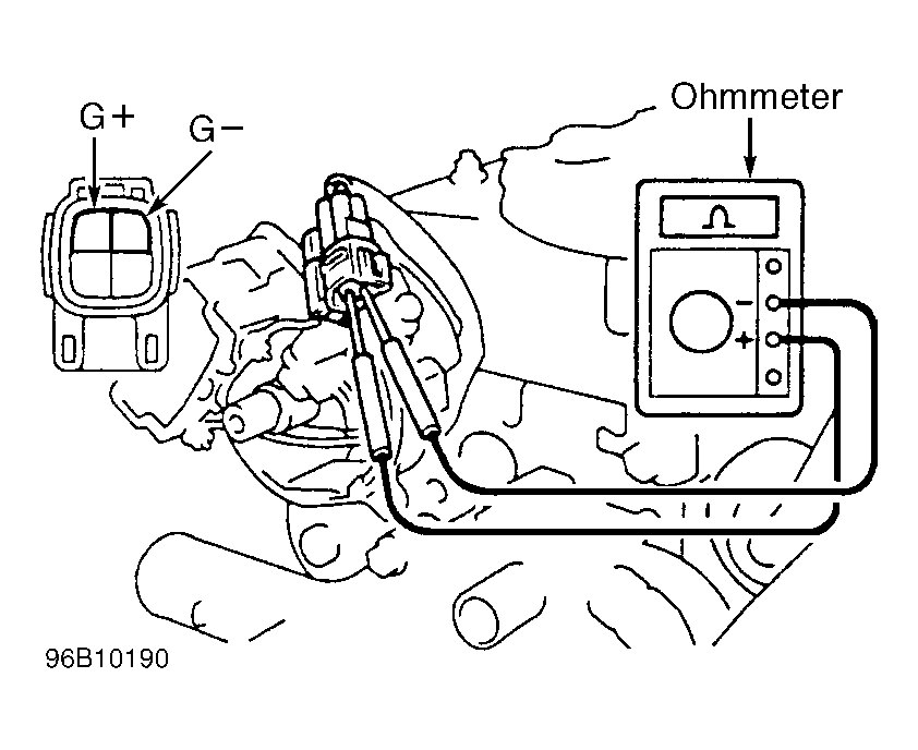 - Disconnect CMP sensor connector. Measure resistance between terminals G+ and G- at sensor connector. See Fig 1. Resistance should be 185-275 ohms (cold sensor) or 240-325 ohms (hot sensor).
