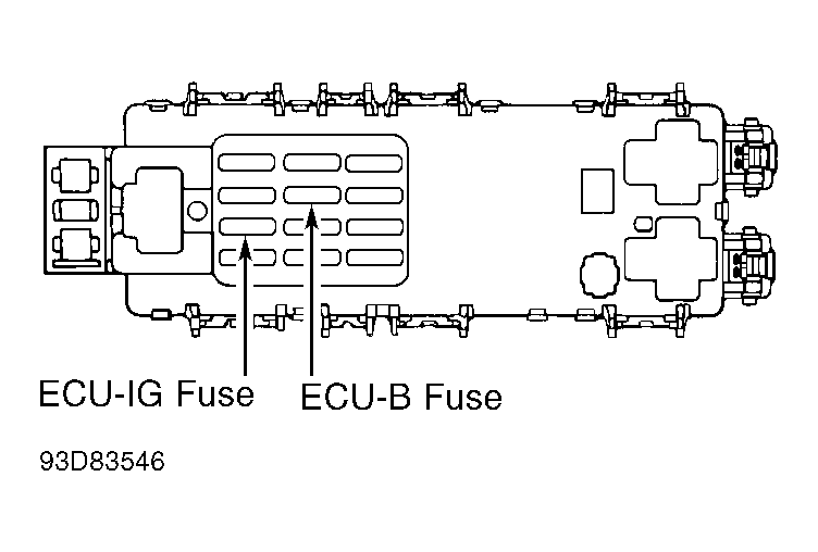 - Locate ECU-IG fuse in junction block No. 1. See Figure. Remove ECU-IG fuse and ensure fuse continuity. If fuse is okay, go to next step. If fuse is not okay, check for short between CC ECU connector terminal No. 14 (Black/Yellow wire) and ECU-IG fuse.