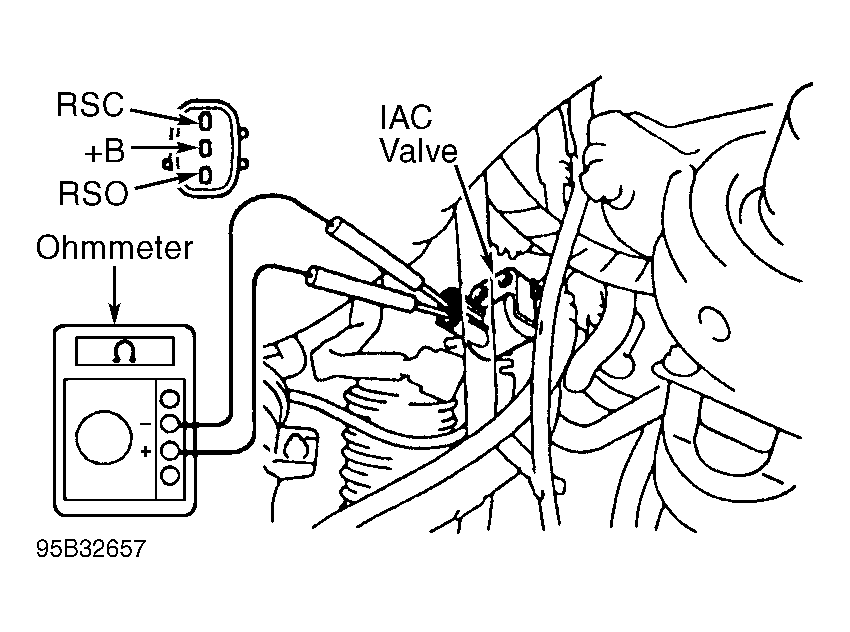 7. To test IAC valve operation, remove IAC valve from throttle body. Apply battery voltage to +B terminal on IAC valve. Apply battery ground to proper terminal and ensure valve opens and closes. See Figure. Replace IAC valve if defective.
