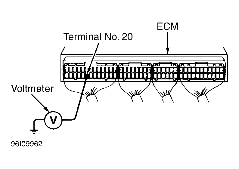 - Turn ignition on. Using voltmeter, check voltage between terminal No. 20 (Red/White wire) on ECM and chassis ground. See Fig 1.
