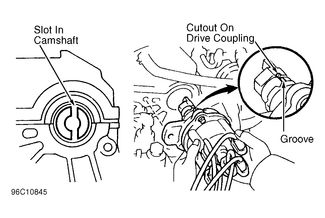 3. Install NEW "O" ring on distributor housing. Coat "O" ring with engine oil. Align cutout on drive coupling with groove on distributor housing. See Fig 1.