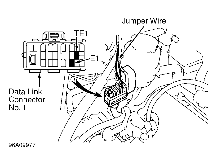 3. Install Jumper Wire (SST 09843-18020) between terminals TE1 and E1 of data link connector No. 1 located in engine compartment. See Figure.