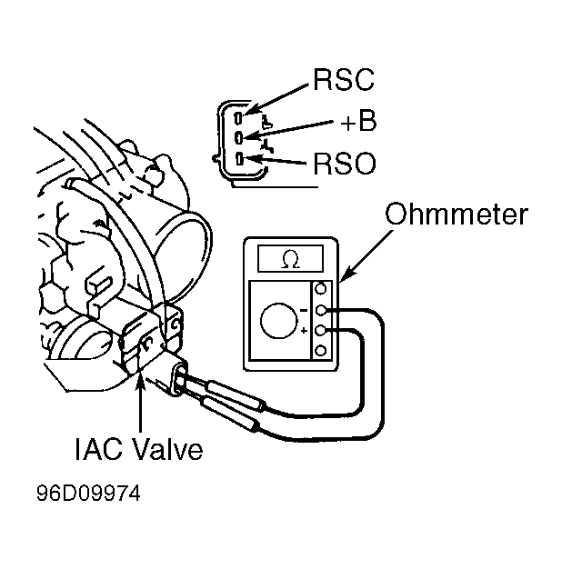 - To test IAC valve resistance, ensure ignition is off. Disconnect electrical connector from IAC valve, located on lower area of throttle body. Using ohmmeter, check resistance between terminal +B and each remaining terminal. See Fig 2.