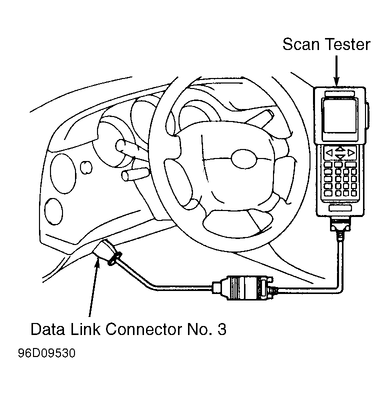 1. Remove cover (if equipped) and install scan tester on data link connector No. 3. See Figure. Turn ignition on. DO NOT start engine.