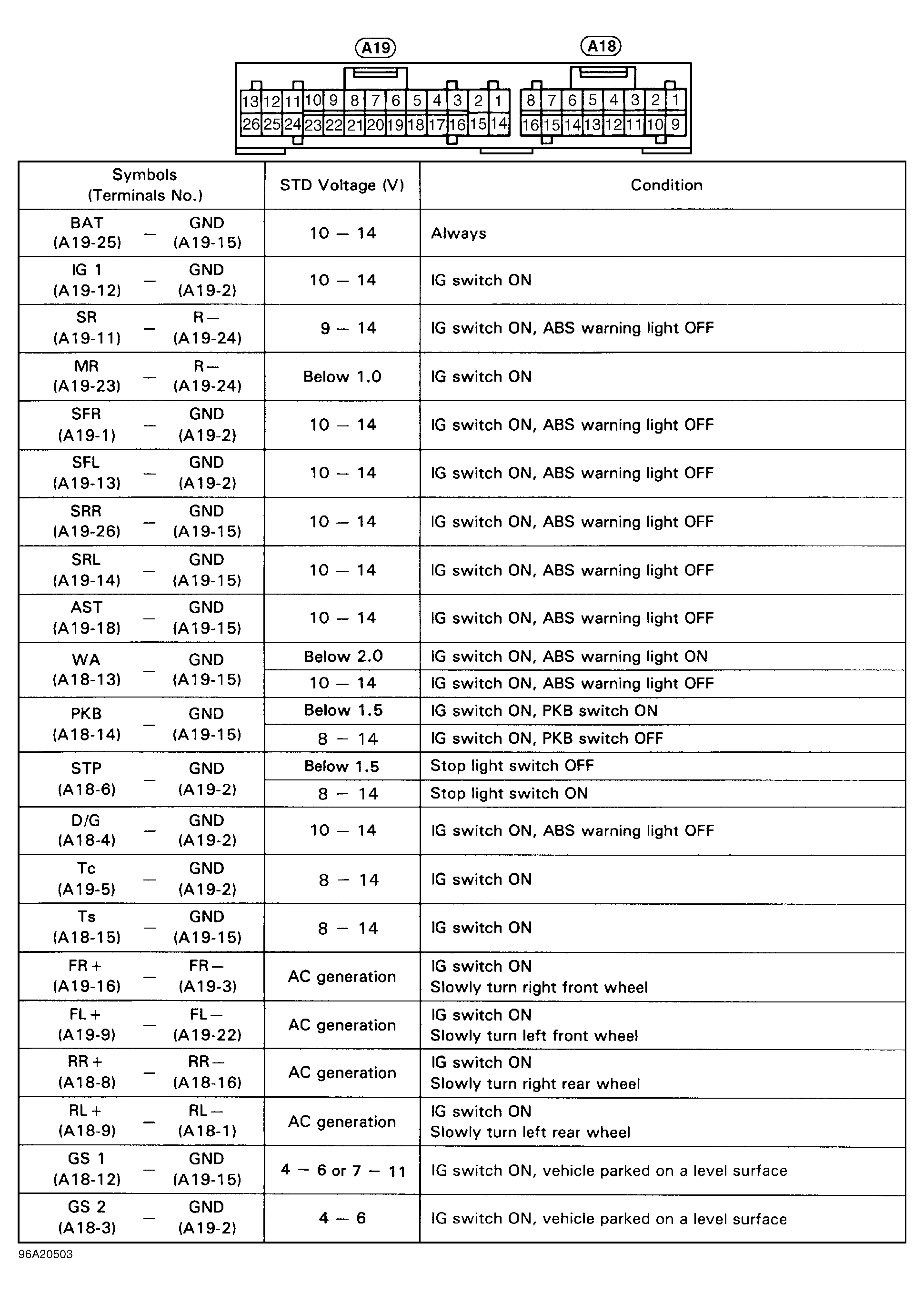 For component testing, see CIRCUIT TESTS . TRAC ECU values can be measured using Toyota Hand-Held Tester and Break-Out Box. TRAC circuits and harness can also be tested by backprobing TRAC ECU connectors and comparing measured voltages with TRAC ECU standard values chart. See Fig 1.