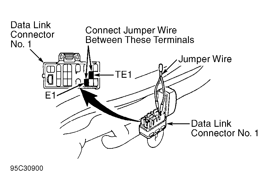 - Install Jumper Wire (SST 09843-18020) between terminals TE1 and E1 of data link connector No. 1 located in engine compartment. See Fig 3.
