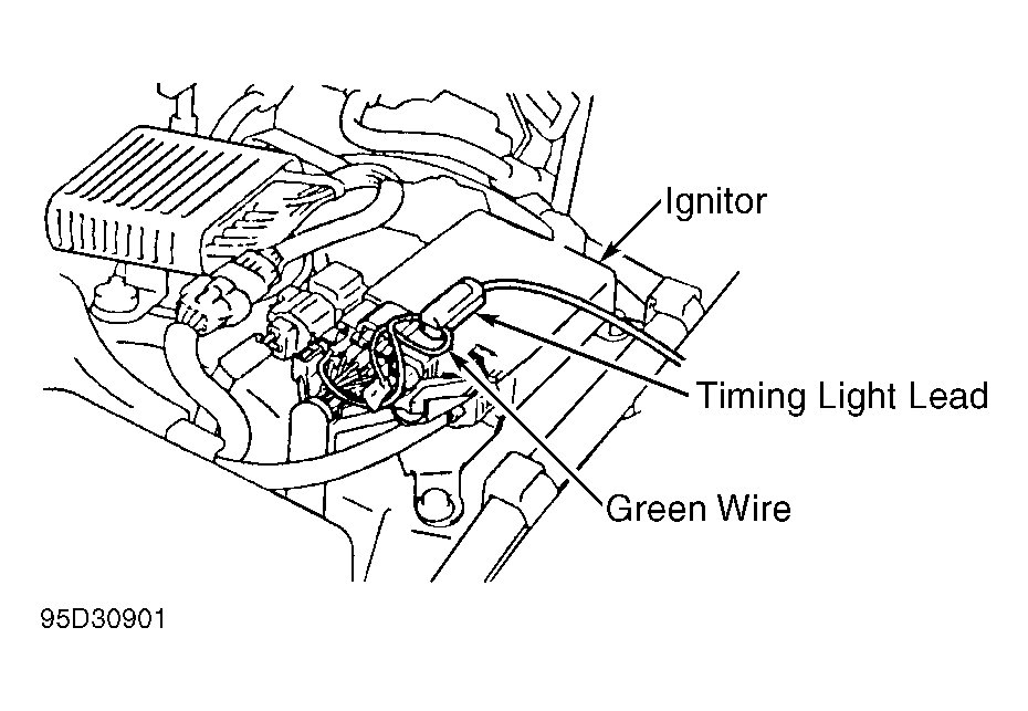 - On turbo models, open cover located above the igniter. Connect timing light lead to Green wire and to battery. See Fig 4. Igniter is located near driver's side strut tower. Connect tachometer to proper terminals of data link connector No. 1 located in engine compartment. See Fig 1 and Fig 2.