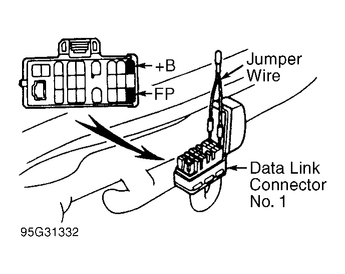 - Install Jumper Wire (SST 09843-18020) between +B and FP terminals of data link connector No. 1. See Fig 1. Data link connector No. 1 is located at passenger's side rear corner of firewall in the engine compartment.