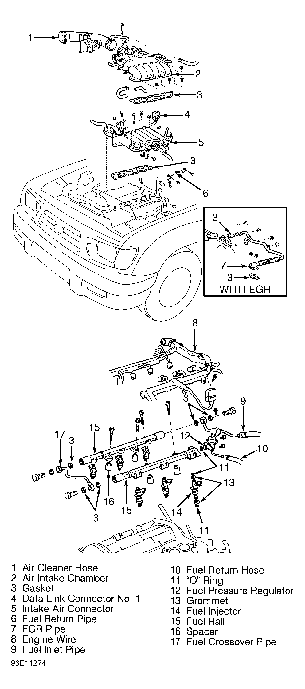 - Remove air intake chamber, intake air connector and gaskets. Remove protector from engine wiring harness and lift engine wiring harness upward for access to fuel pressure regulator.