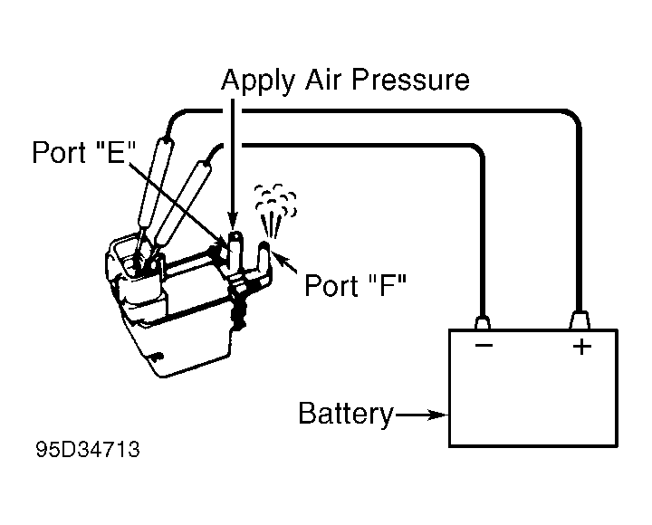 - Apply air pressure to port "E" without battery connected. See Fig 1. No air pressure should flow from port "F". Apply battery voltage and ground to electrical terminals on EGR VSV. See Fig 1. Apply air pressure to port "E". Air pressure should now flow from port "F" at end of EGR VSV. Replace EGR VSV if defective.