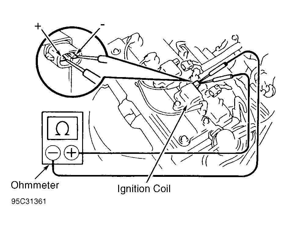 - Using ohmmeter, check ignition coil primary resistance between ignition coil positive (+) and negative (-) terminals. These are the terminals that electrical connector was installed on. See Fig 1 and Fig 2. Replace ignition coil if primary resistance is not within specification. See IGNITION COIL RESISTANCE table.