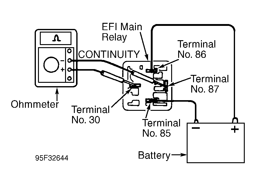 - To test EFI main relay operation, apply battery voltage and ground to relay and use ohmmeter to check continuity between specified terminals. See Fig 1 and Fig 2. Replace EFI main relay if defective.