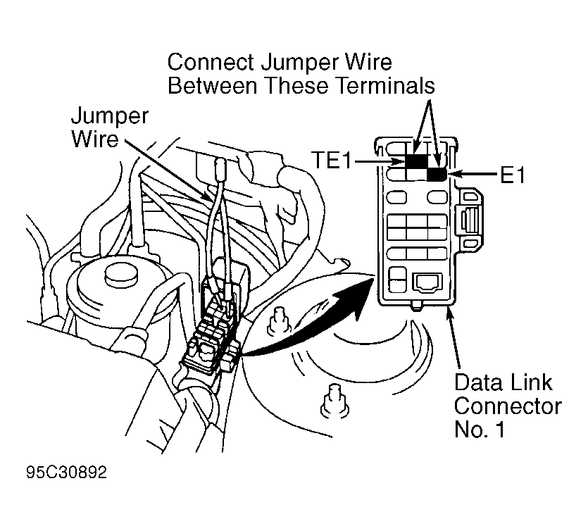 - Install Jumper Wire (SST 09843-18020) between terminals TE1 and E1 of data link connector No. 1. See Fig 2.