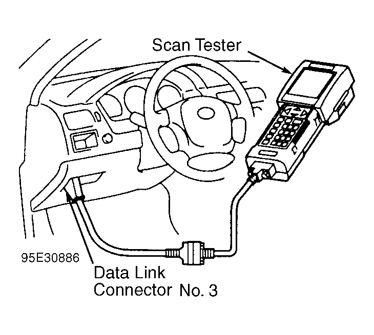 - Start and warm engine to normal operating temperature. Shut engine off. Connect timing light to spark plug wire on cylinder No. 1 (front cylinder at timing belt end of engine). Remove cover and connect scan tester to data link connector No. 3. See Fig 1. Scan tester is used to read engine RPM.