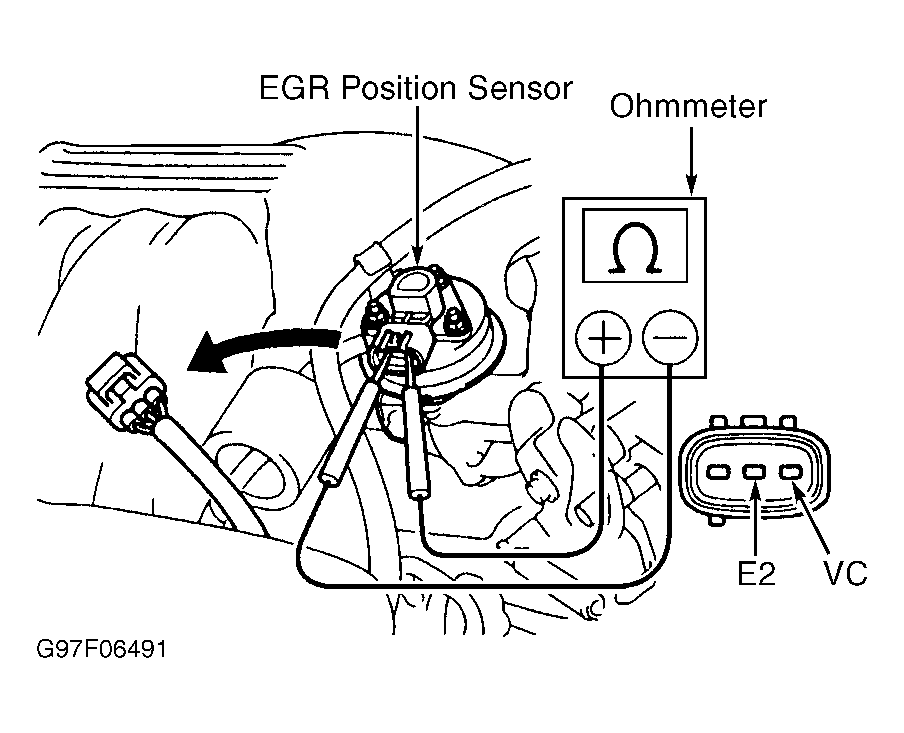 - Using ohmmeter, check resistance between terminals E2 and VC on EGR position sensor. See Fig 1. Resistance should be 1500-4300 ohms. If resistance is within specification, reinstall electrical connector on EGR position sensor and go to next step. If resistance is not within specification, replace EGR position sensor.