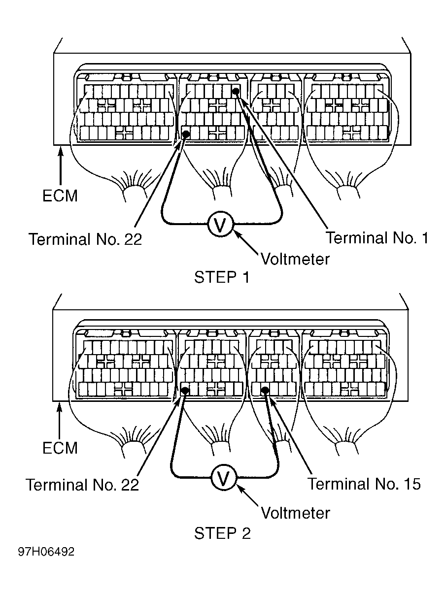 - Connect voltmeter between terminals No. 15 and 22 on ECM. Perform STEP 2. See Fig 2. See ECM TERMINAL APPLICATION table.