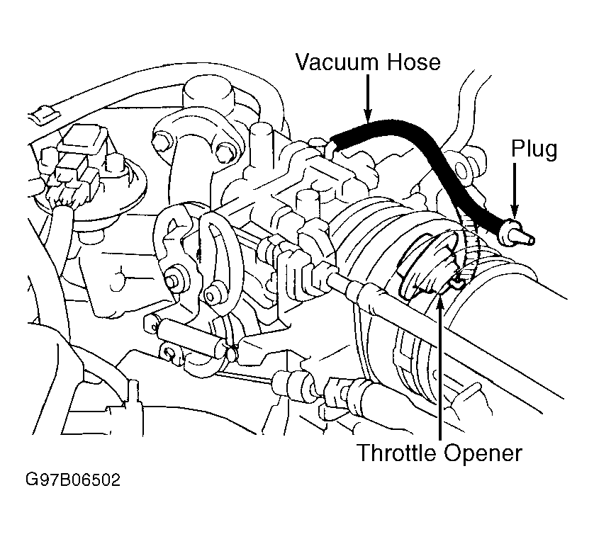 - Shut engine off. Disconnect and plug vacuum hose at throttle opener. See Fig 1. Start engine and note engine speed. Engine speed should be 900-1950 RPM.