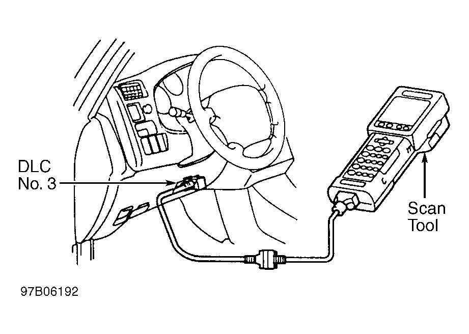 1. Connect scan tool to Data Link Connector (DLC) No. 3. See Figure. Turn ignition on with engine off. Turn scan tool on. Using scan tool manufacturer's instructions, check for DTCs and freeze-frame data.