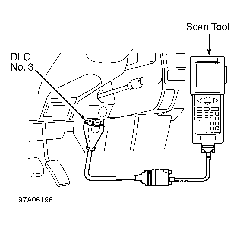 1. Connect scan tool to Data Link Connector (DLC) No. 3. See Figure. Turn ignition on with engine off. Turn scan tool on. Using scan tool manufacturer's instructions, check for DTCs and freeze-frame data.