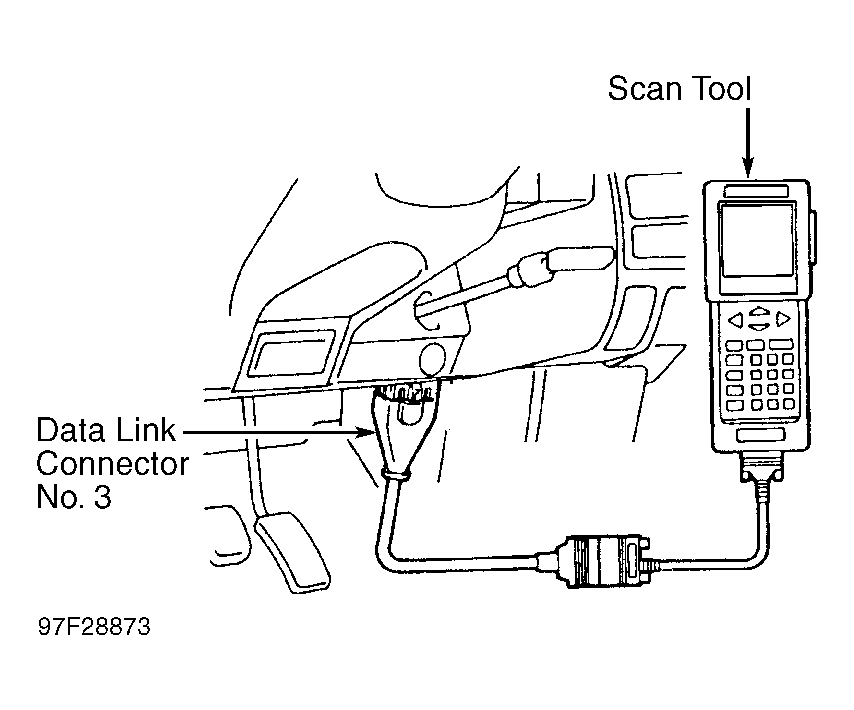 1. Remove cover (if equipped) and connect scan tool to data link connector No. 3. See Fig 1. Turn ignition on. DO NOT start engine.