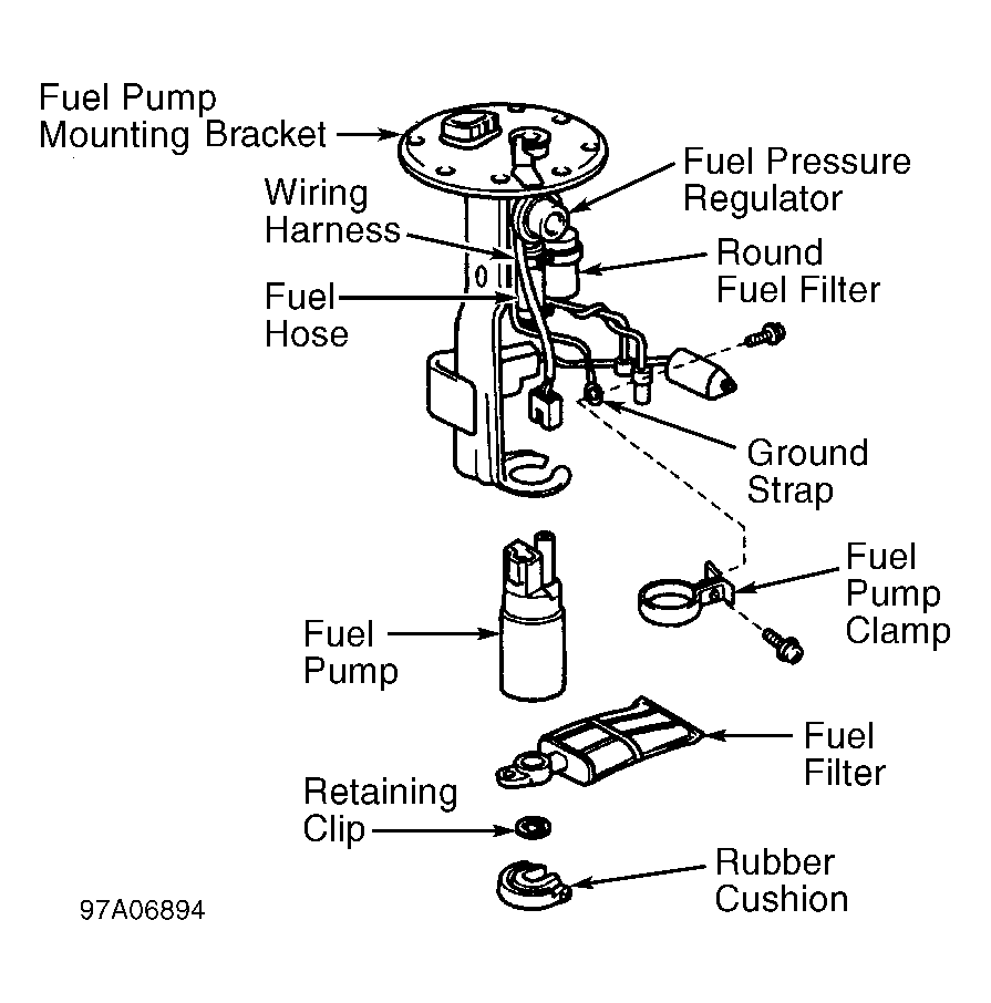 - Remove clip from round fuel filter. Disconnect fuel hose from fuel pressure regulator. See Figure. Remove fuel pressure regulator retaining screw. Remove fuel pressure regulator with "O" ring from fuel pump mounting bracket. Remove "O" ring from fuel pressure regulator.