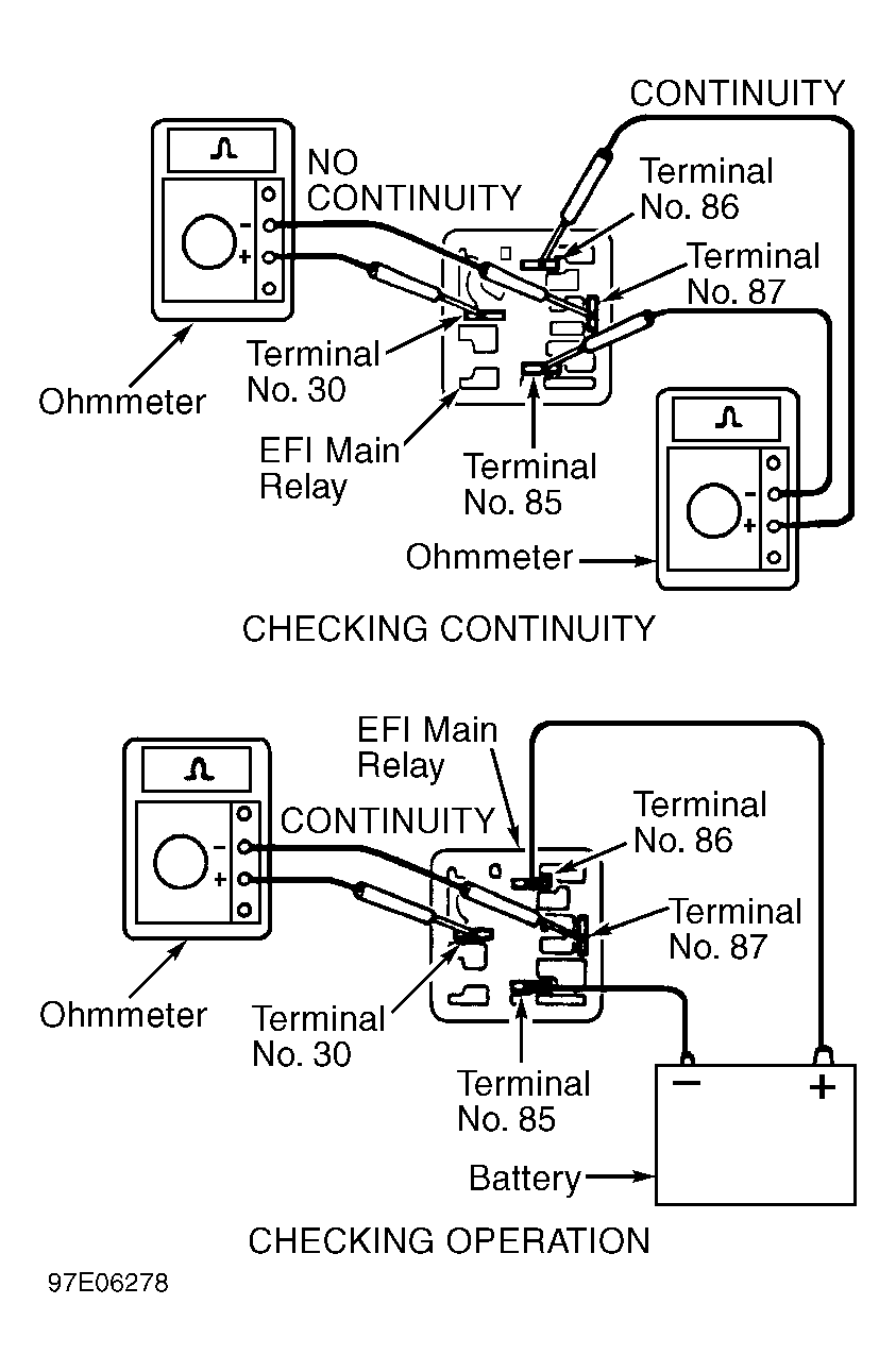 - To check EFI main relay operation, apply battery voltage and ground to relay and use ohmmeter to check continuity between specified terminals. See Fig 1. Replace EFI main relay if defective.