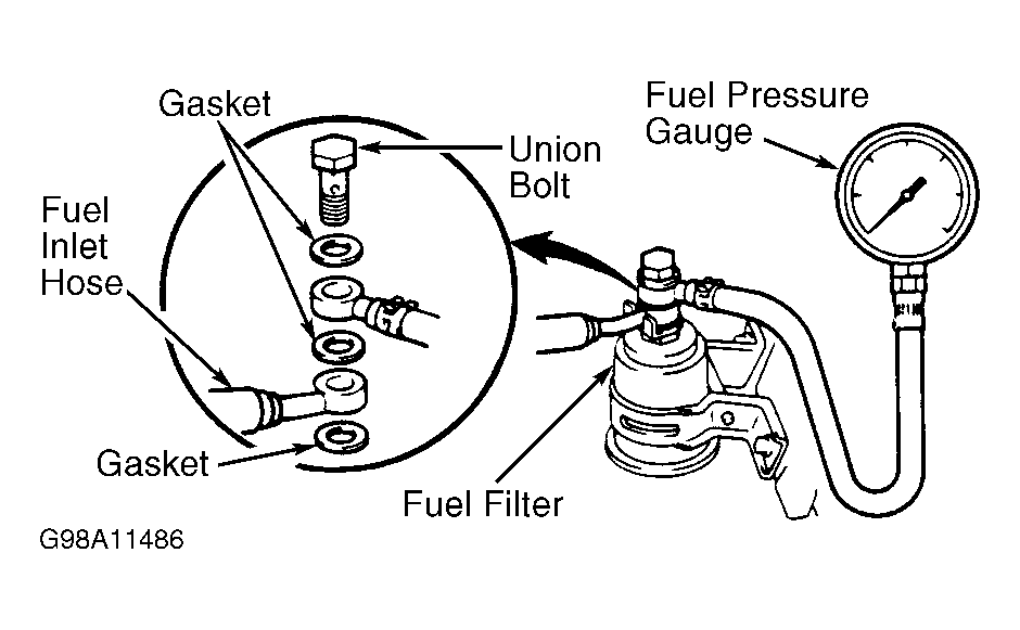 9. Disconnect negative battery cable. Remove fuel pressure gauge. Using NEW gaskets, reinstall fuel inlet hose on fuel filter. Tighten union bolt to 21 ft. lbs. (29 N.m).