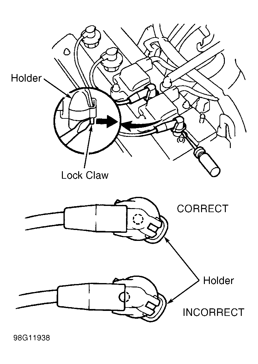 - When installing spark plug wire on ignition coil, ensure spline on ignition coil aligns with spline on holder. Ensure holder is properly positioned on grommet and ignition coil. See Fig 1. Lightly pull upward on holder to ensure lock claw is locked in place.