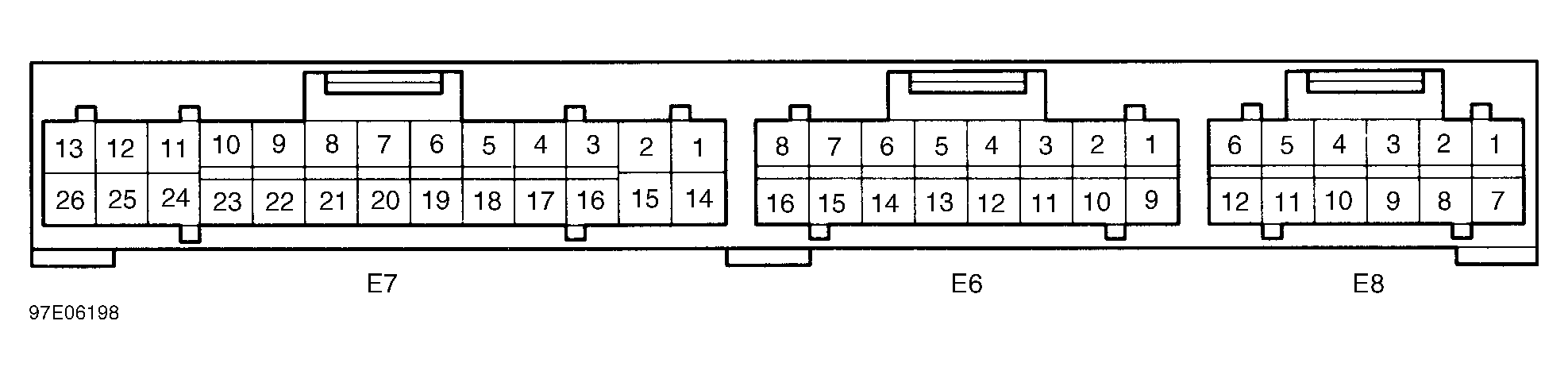 3. Access ECM behind glove box. Turn ignition on. Using DVOM, backprobe ECM connector. Measure voltage between ground and injector terminals at ECM E7 connector. See IDENTIFYING INJECTOR TERMINALS  table. See Figure. If voltage is 9-14 volts for each circuit, go to step 5). If voltage is not 9-14 volts, go to next step.
