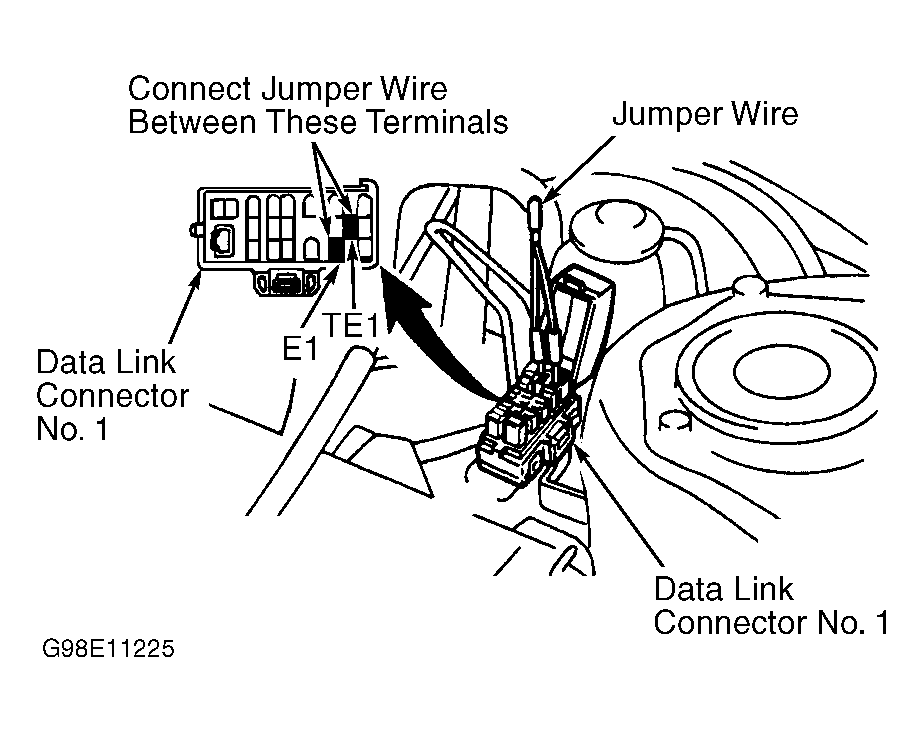1. Start engine and warm to normal operating temperature. Turn all accessories off. Ensure A/C is off. Shift transaxle lever into Neutral. Connect scan tool to Data Link Connector (DLC) No. 3. See Figure. Note engine RPM. Using a jumper wire, connect terminals TE1 and E1 at DLC No. 1 in engine compartment. See Fig 1. Note engine RPM and compare RPM readings. If difference in engine speed is more than 100 RPM, go to step  9. If difference in engine speed is 100 RPM or less, go to next step.