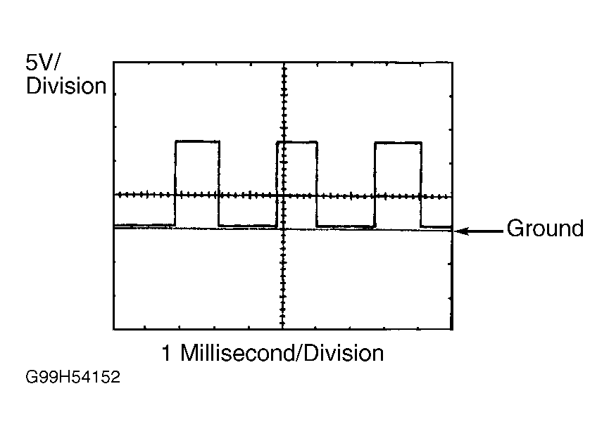 2. Turn ignition off. Access ECM below stereo, behind instrument panel, just in front of center console. On models with 4A/T transmission, connect an oscilloscope by backprobing between ground and terminal No. 18 (Blue/Black wire) at ECM harness connector E7. See Figure. On models without 4A/T transmission, connect an oscilloscope by backprobing between ground and terminal No. 15 (Blue/Black wire) at ECM harness connector E4. See Figure. On all models, start engine and let idle. Oscilloscope waveform should be as illustrated. See Fig 2. If waveform is as shown, go to step  6. If waveform is not as shown, go to next step.