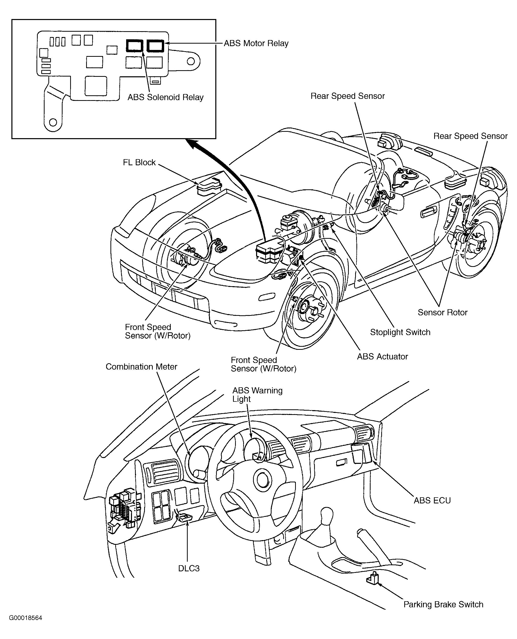 Anti-Lock Brake System (ABS) consists of an ABS Electronic Control Unit (ECU), ABS solenoid relay, ABS motor relay, ABS actuator and 4 speed sensors. See Fig 1.