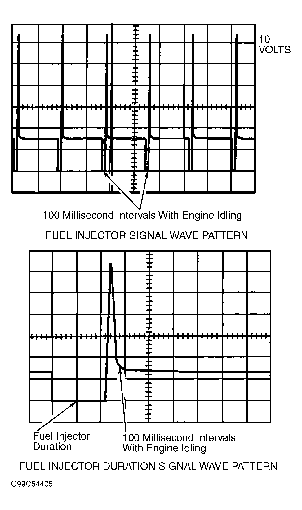 5. Turn ignition on. Using voltmeter, check voltage between body ground and appropriate terminal at ECM electrical connector E7 for misfiring cylinder. See ECM TERMINAL #10 TO #40 IDENTIFICATION FOR FUEL INJECTORS  table. These are the #10 to #40 terminals for fuel injectors at ECM. Voltage should be 9-14 volts. Using oscilloscope, check fuel injector signal wave pattern and fuel injector duration signal wave pattern with engine idling at appropriate terminal at ECM electrical connector E7 for misfiring cylinder. Fuel injector signal wave pattern and fuel injector duration signal wave pattern should be properly displayed with 100 millisecond intervals. See Fig 1. If voltage is within specification, and fuel injector signal wave pattern and fuel injector duration signal wave pattern are okay, go to step  9. If voltage is not within specification, or fuel injector signal wave pattern or fuel injector duration signal wave pattern are not okay, go to next step.