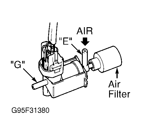 4. Apply battery voltage and ground to EGR VSV terminals. Air applied to port "E" should flow from small filter on end of EGR VSV. Remove battery voltage from valve terminals. Air applied to port "E" should flow from port "G". If EGR VSV does not operate as specified, replace EGR VSV. If EGR VSV operates as specified, repair open or short in wiring between engine compartment fuse block and ECM. See WIRING DIAGRAMS article.