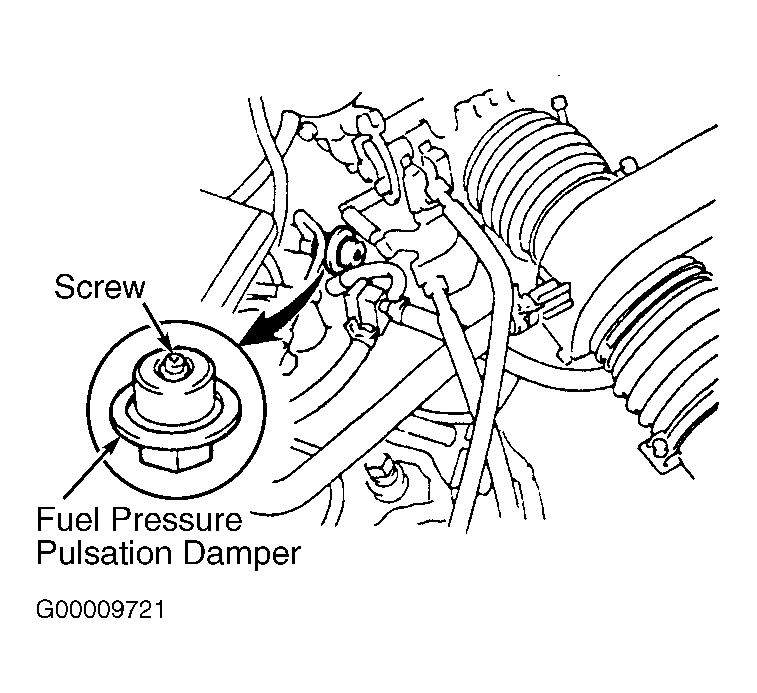 - Check operation of fuel pump by using scan tool. See FUEL PUMP OPERATION under FUEL SYSTEMS in BASIC DIAGNOSTIC PROCEDURES - V6 & V8 article. Ensure screw at center of fuel pressure pulsation damper rises upward when fuel pump is operated to indicate fuel pressure. Fuel pressure pulsation damper is located on end of fuel rail. See Fig 1. If screw at center of fuel pressure pulsation damper does not rise upward when fuel pump is operated to indicate fuel pressure, go to step 4. If screw at center of fuel pressure pulsation damper rises upward when fuel pump is operated to indicate fuel pressure, check starter signal circuit. See STARTER SIGNAL CIRCUIT .