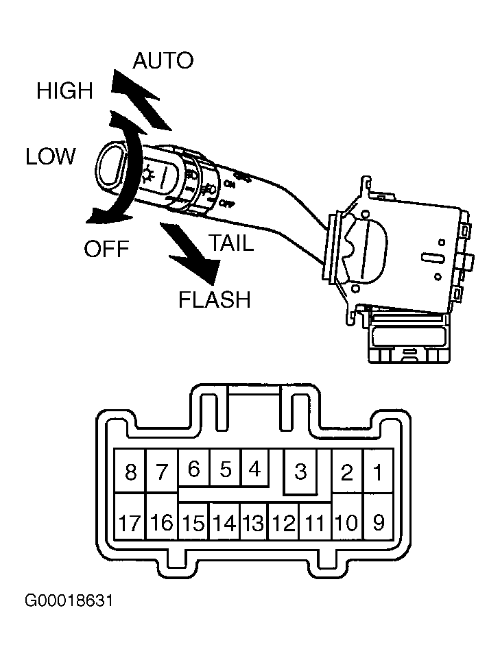 Using ohmmeter, check for no continuity and continuity between specified electrical terminals on headlight control switch in relation to headlight control switch position. See Fig 1. See HEADLIGHT CONTROL SWITCH CONTINUITY table. Replace headlight control switch if defective. See HEADLIGHT CONTROL SWITCH under REMOVAL & INSTALLATION.HEADLIGHT CONTROL SWITCH CONTINUITY