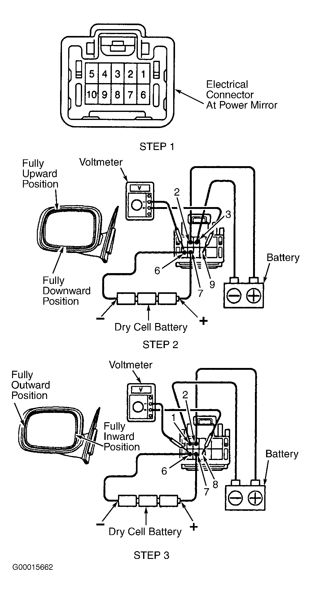 2. Connect a series of 3 (1.5 volt) dry cell batteries together and then using jumper wires, connect positive lead on dry cell batteries to terminal No. 7 and negative lead to terminal No. 6 on electrical connector at power mirror. Perform STEP 2 in illustration. See Fig 1. Connect positive lead of voltmeter to terminal No. 9 and negative lead to terminal No. 6 on electrical connector at power mirror. Perform STEP 2 in illustration. See Fig 1.