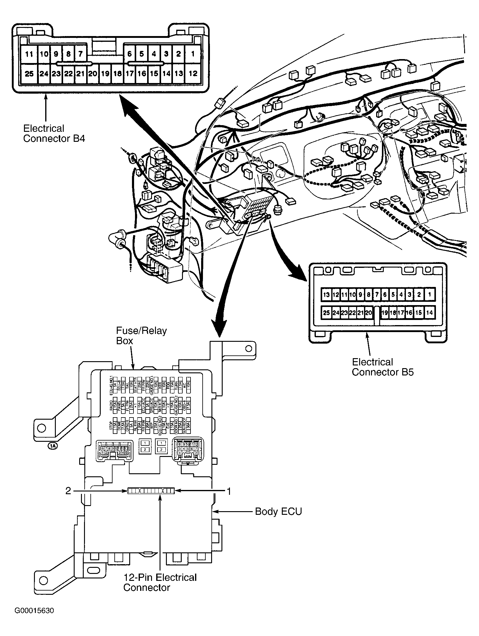 - Check key unlock warning switch circuit by checking Red/Yellow wire and electrical connectors between terminal No. 2 at key unlock warning switch and terminal No. 17 at electrical connector B4 at body Electronic Control Unit (ECU). See WIRING DIAGRAMS in KEYLESS ENTRY SYSTEMS - AVALON article. Key unlock warning switch may also be referred to as unlock switch. Body ECU is located at driver's side of instrument panel on the fuse/relay box. See Figure. Electrical connector B4 (25-pin) and electrical connector B5 (25-pin) are located at each side of body ECU and a 12-pin electrical connector at rear of body ECU. See Figure. For electrical connector B4 location and terminal identification, see Figure. If wiring harness and electrical connectors are okay, go to next step. If wiring harness or electrical connector is defective, repair as necessary and recheck operation of two-operation unlock function.