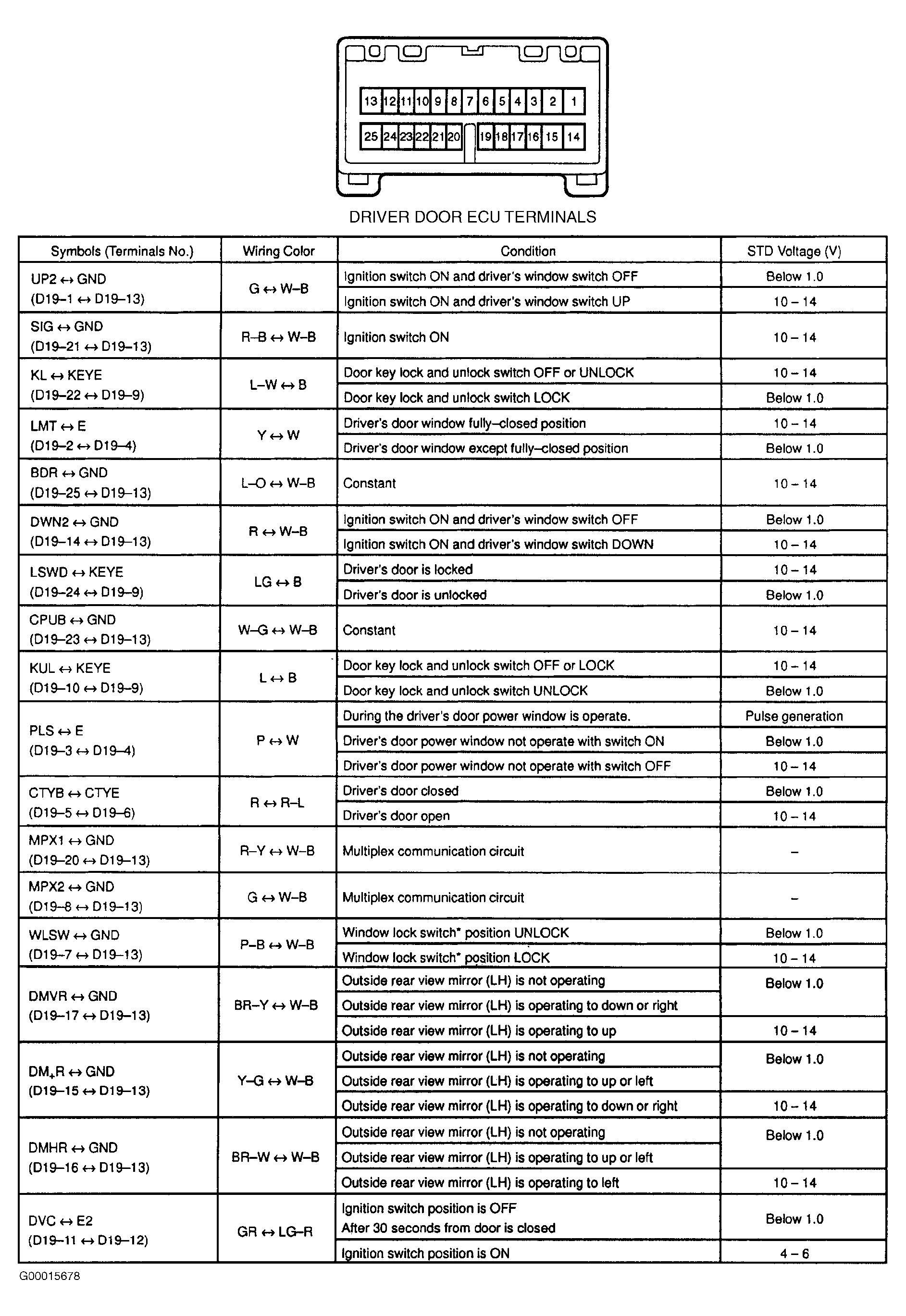 - Turn ignition on. Using voltmeter, check voltage between ground circuit at terminal No. 13 (White/Black wire) and terminal No. 21 (Red/Black wire) at driver's door ECU. See Figure. Voltage should be 10-14 volts. Turn ignition off. Disconnect electrical connector at driver's door ECU. Using voltmeter, check voltage between ground circuit at terminal No. 13 (White/Black wire) and terminals No. 23 (White/Green wire) and No. 25 (Blue/Orange wire) at driver's door ECU. See Figure. Voltage should be 10-14 volts. If any voltage reading is not within specification, go to next step. If all voltage readings are within specification, go to step 6.
