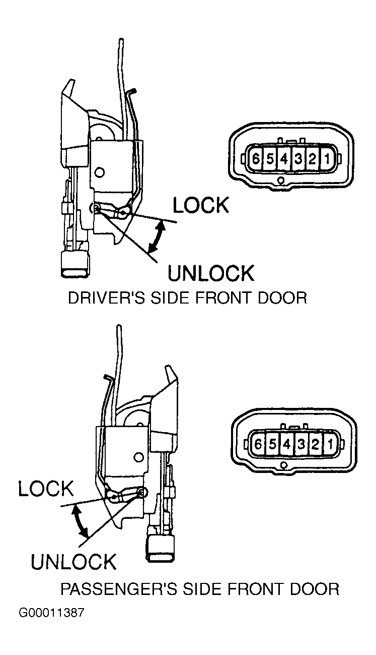 - Disconnect 6-pin electrical connector at door lock assembly. Note electrical terminal identification on door lock assembly and switch positions. See Fig 1.