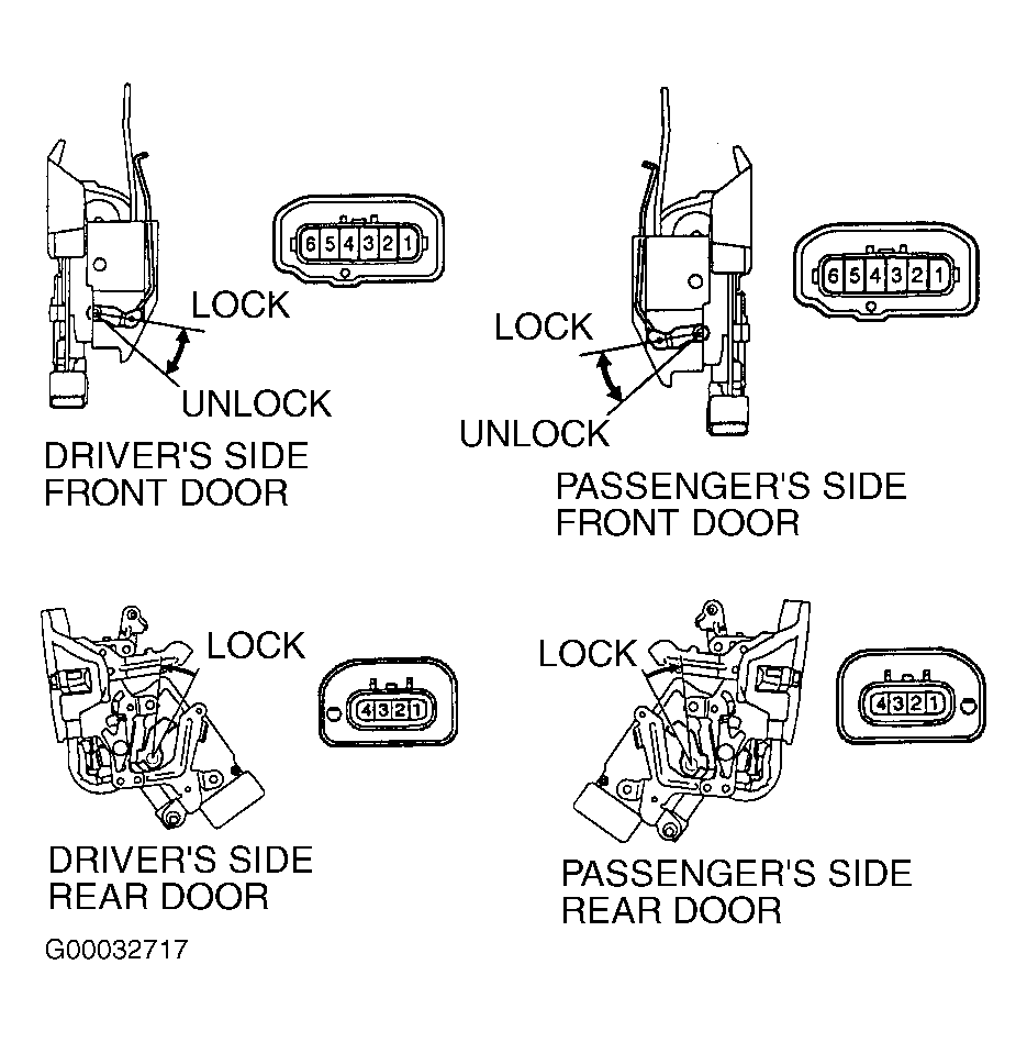 - Remove door panel for access to appropriate door lock assembly which contains the door lock motor and door unlock detection switch. See Figure.
