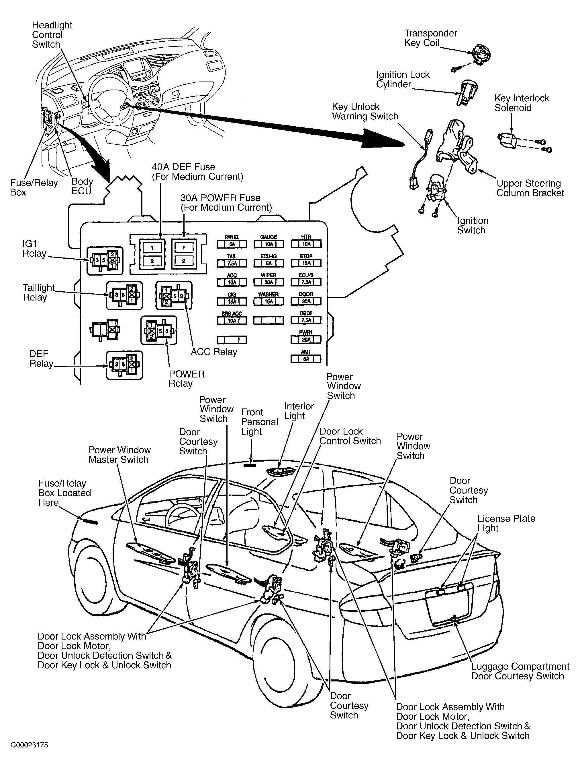 3. Check wiring harness and electrical connectors between door courtesy switch for driver's side front door and body Electronic Control Unit (ECU). See WIRING DIAGRAMS in POWER DOOR LOCKS & REMOTE KEYLESS ENTRY SYSTEMS - PRIUS article. Body ECU is located at driver's side of instrument panel on the fuse/relay box and contains an 18-pin and 20-pin electrical connector. See Figure. If wiring harness and electrical connectors are okay, go to next step. If wiring harness or electrical connector is defective, repair as necessary and recheck automatic turn off system operation.