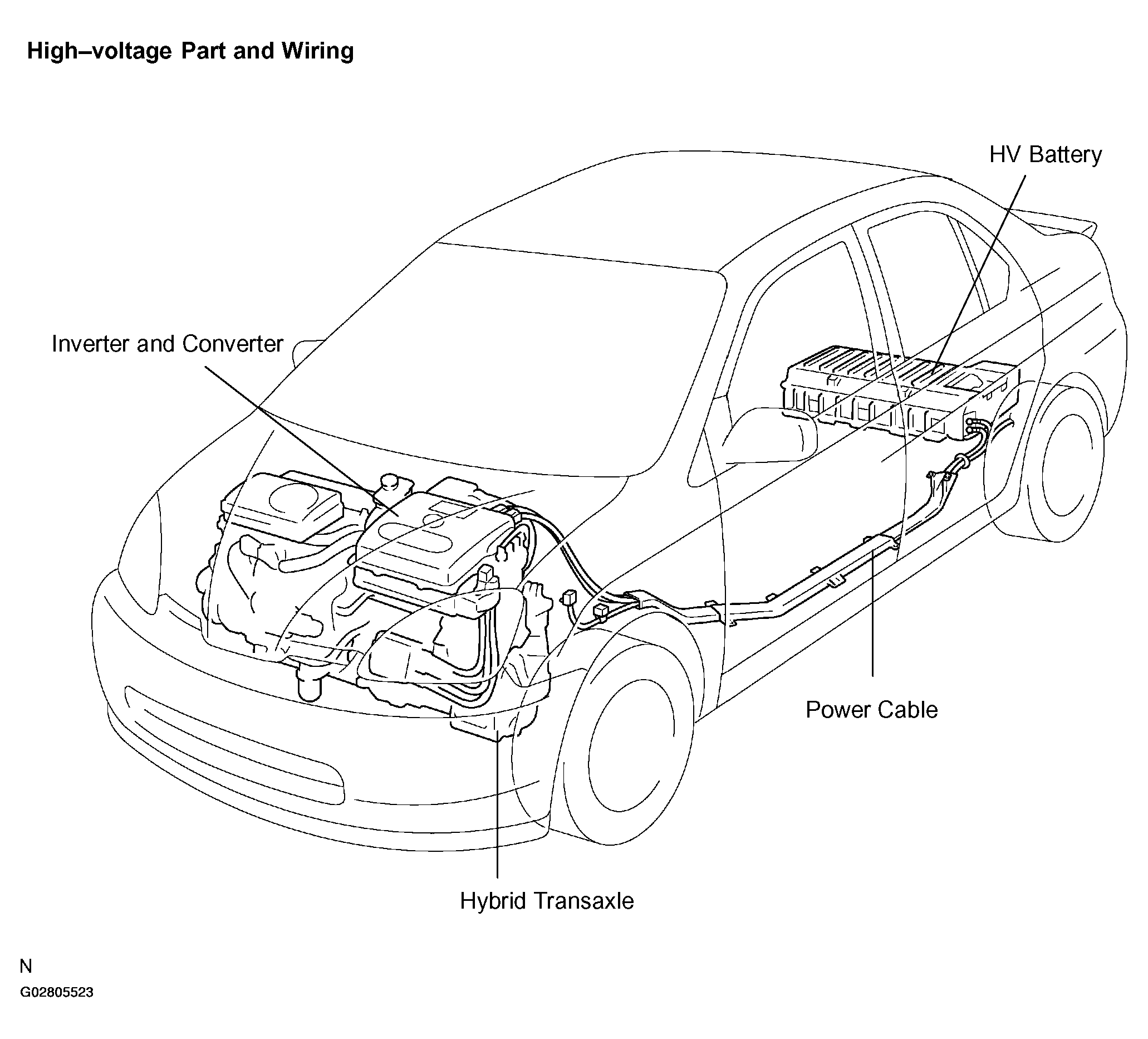 2. All the high-voltage wire harness connectors are colored orange: the HV battery and other high-voltage components are identified by the "High Voltage" caution labels. Do not carelessly touch these wires and components.