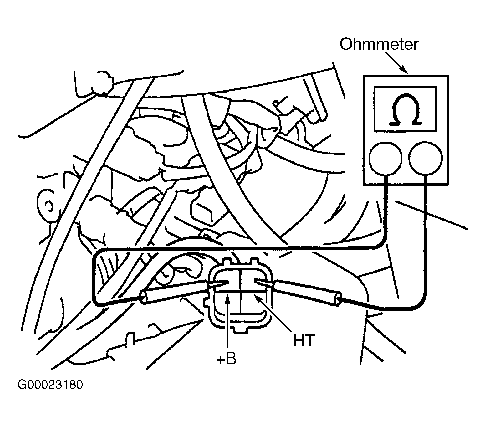 4. Disconnect electrical connector for heated oxygen sensor (bank No. 1, sensor No. 2) located on exhaust manifold below catalytic converter. See Figure. Using ohmmeter, check resistance between +B and HT terminals on electrical connector for heater on heated oxygen sensor (bank No. 1, sensor No. 2). See Figure. Resistance should be 11-16 ohms at 68°F (20°C) and 23-32 ohms at 1472°F (800°C). If resistance is within specification, replace catalytic converters along with exhaust manifold. If resistance is not within specification, replace heated oxygen sensor (bank No. 1, sensor No. 2).