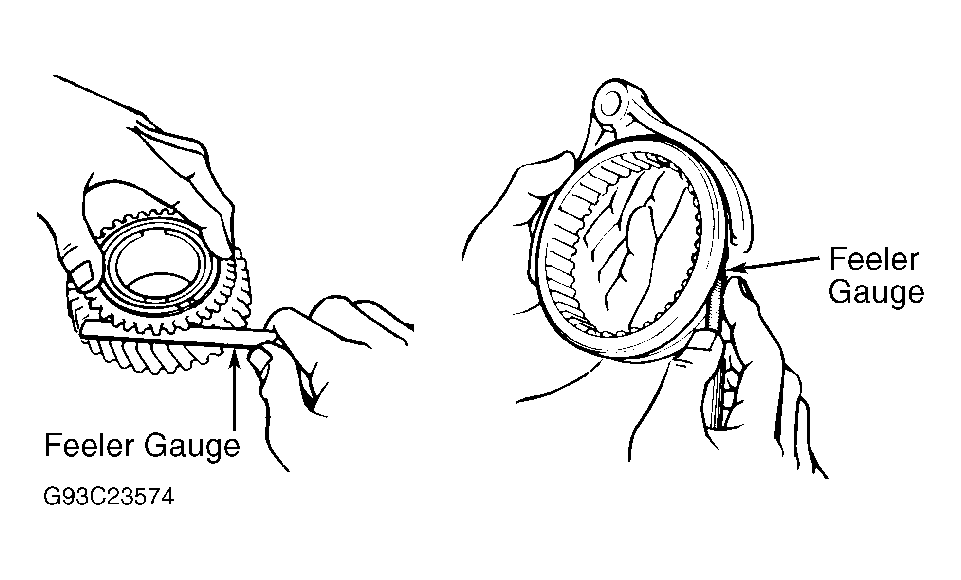 Measure clearance between hub sleeve and shift fork. Service limit is .039" (1.00 mm). If clearance exceeds specification, replace shift fork or hub sleeve. See Figure.